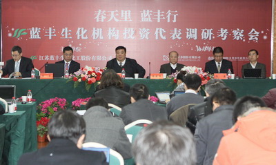 为了使机构投资者更深刻直观地了解和认识蓝丰生化,2月22日蓝丰生化举行了“春天里,蓝丰行” 机构投资者代表实地调研活动。蓝丰生化董事长杨振华、总经理梁华中、董事会秘书、副总经理陈康和财务总监熊军、集团总经济师熊炬和二十多家机构投资代表30余人参加了此次活动,大家畅谈公司发展战略,公司领导就大家关心的问题作了详细解答,会议由东吴证券资本市场部总经理杨庆林主持。会后机构投资代表实地考察公司的生产线,感受资本市场新锐、农化新蓝筹--蓝丰生化强劲的发展态势及公司管理层的风采。